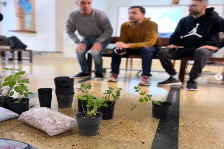 Estudiantes y Profes de Nivel Secundario recibieron a Tomás y Nicolás, quienes generosamente donaron su tiempo para acompañarnos en el Proyecto Ambiental de Huerta, Compost y Mariposario.